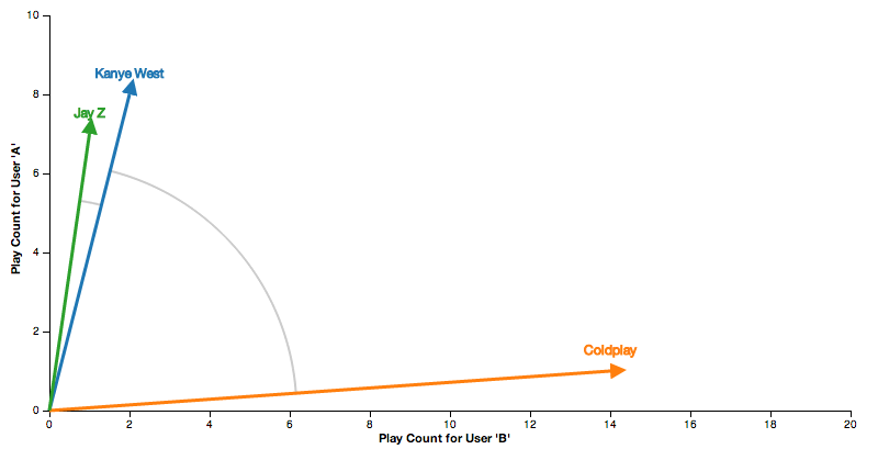 At the time, I think I arrogantly responded with something like "Thats easy! I can think of like a dozen ways of calculating this!". Which of course was profoundly unhelpful and probably slightly infuriating. Once he calmed down, I sketched out how I would calculate the distance between any two artists - and use that distance as a ranking function to build this feature.